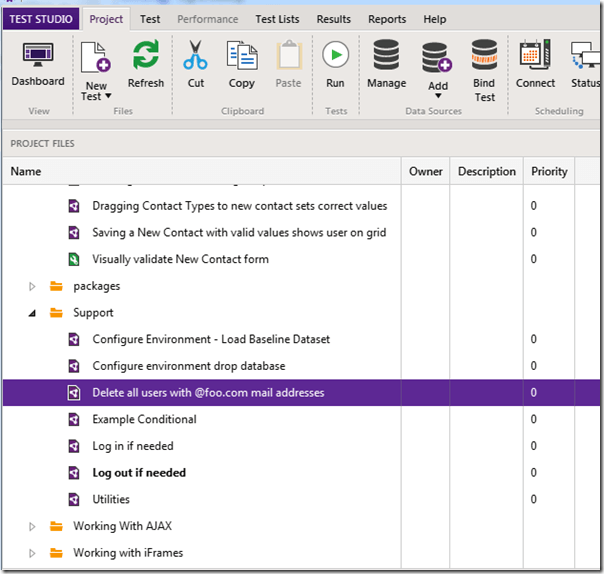 In the figure below we’re using a test that handles cleaning up test users from the database. Note the test’s name says nothing about whether the cleanup is done via a command-line utility, web service end point, or a direct call to a stored procedure in the database.