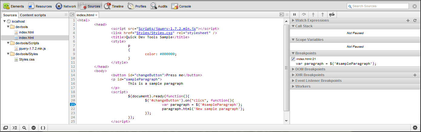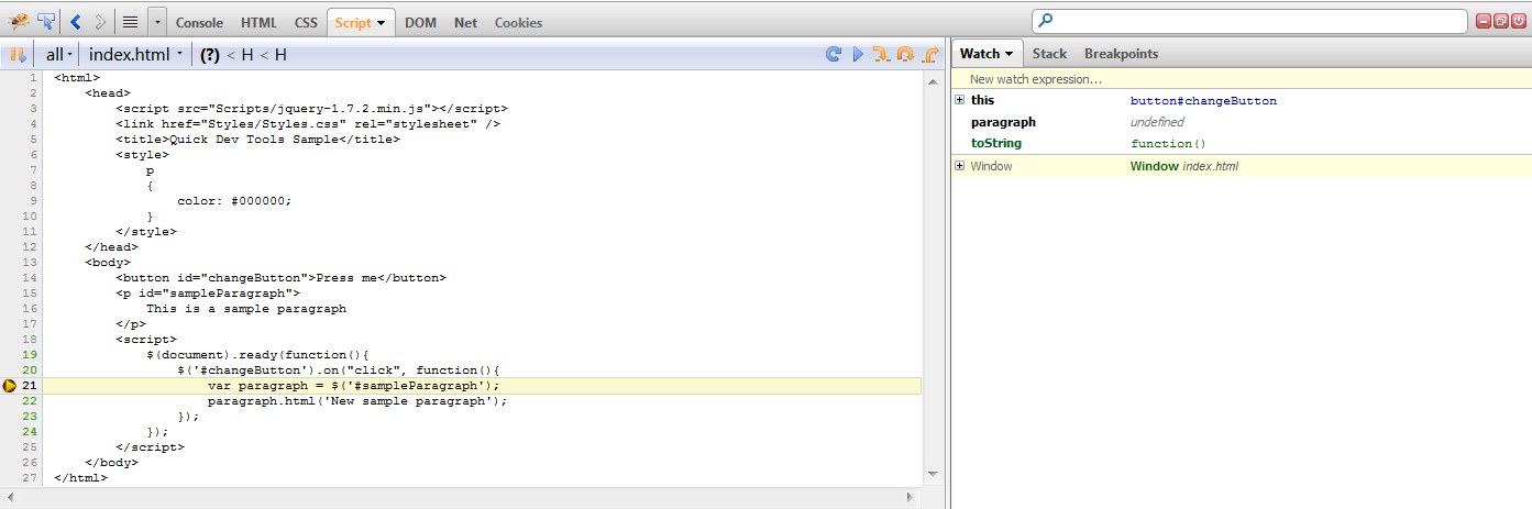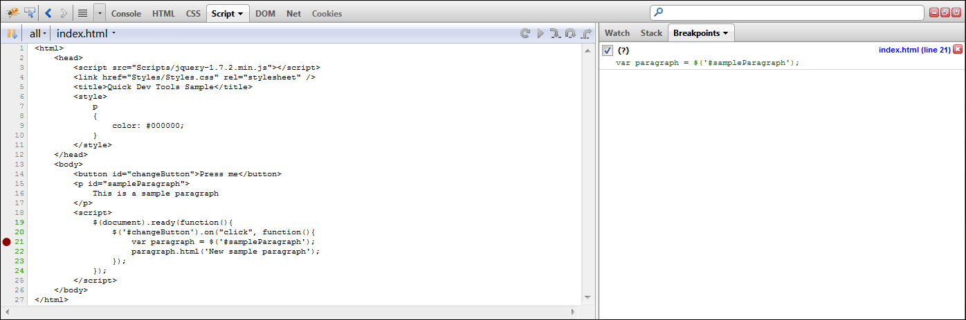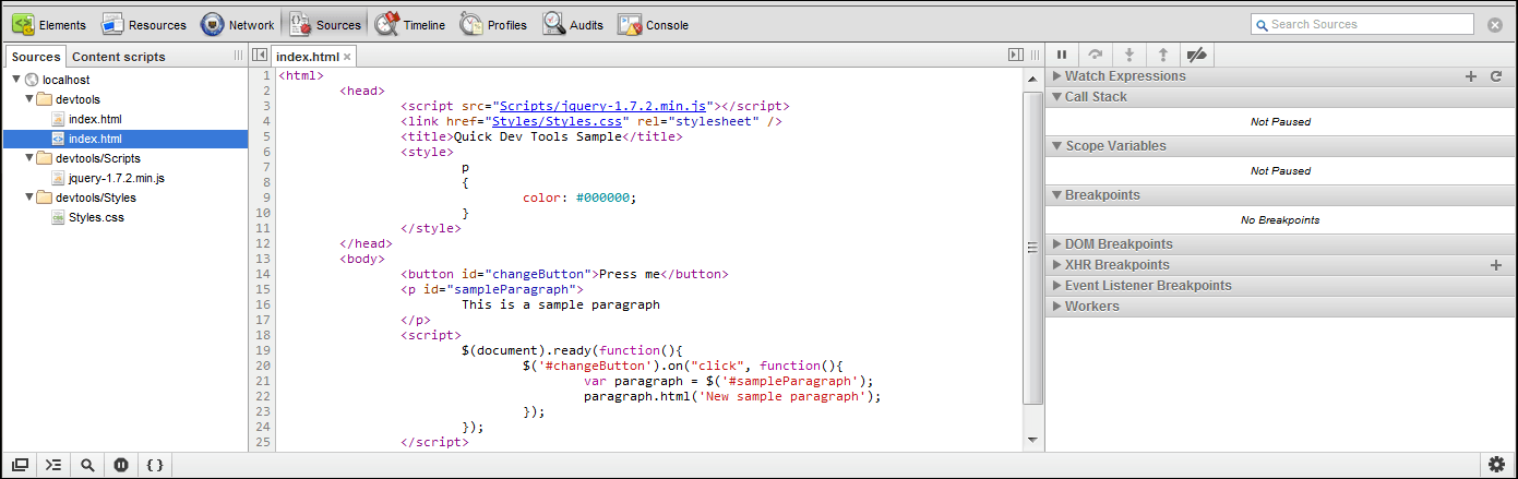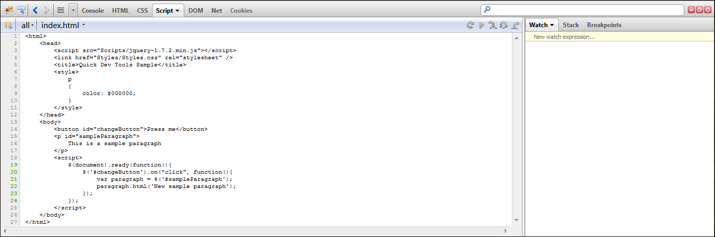 <html> <head> <script src="Scripts/jquery-1.7.2.min.js"></script> <link href="Styles/Styles.css" rel="stylesheet" /> <title>Quick Dev Tools Sample</title> <style> p { color: #000000; } </style> </head> <body> <button id="changeButton">Press me</button> <p id="sampleParagraph"> This is a sample paragraph </p> <script> $(document).ready(function(){ $('#changeButton').on("click", function(){ var paragraph = $('#sampleParagraph'); paragraph.html('New sample paragraph'); }); }); </script> </body></html>The important part here is the JavaScript that I’ve thrown in there inside of the HTML document. All it does is grab my paragraph element and change the HTML so that the text is slightly altered. While it’s a simple script it will do a lot for us in demonstrating what the Scripts tab can do and who isn’t a fan of having simple things teaching us a lot?