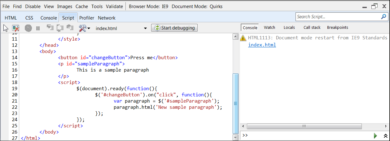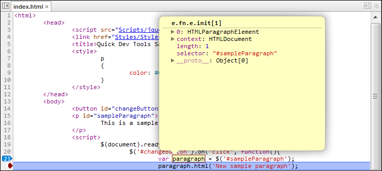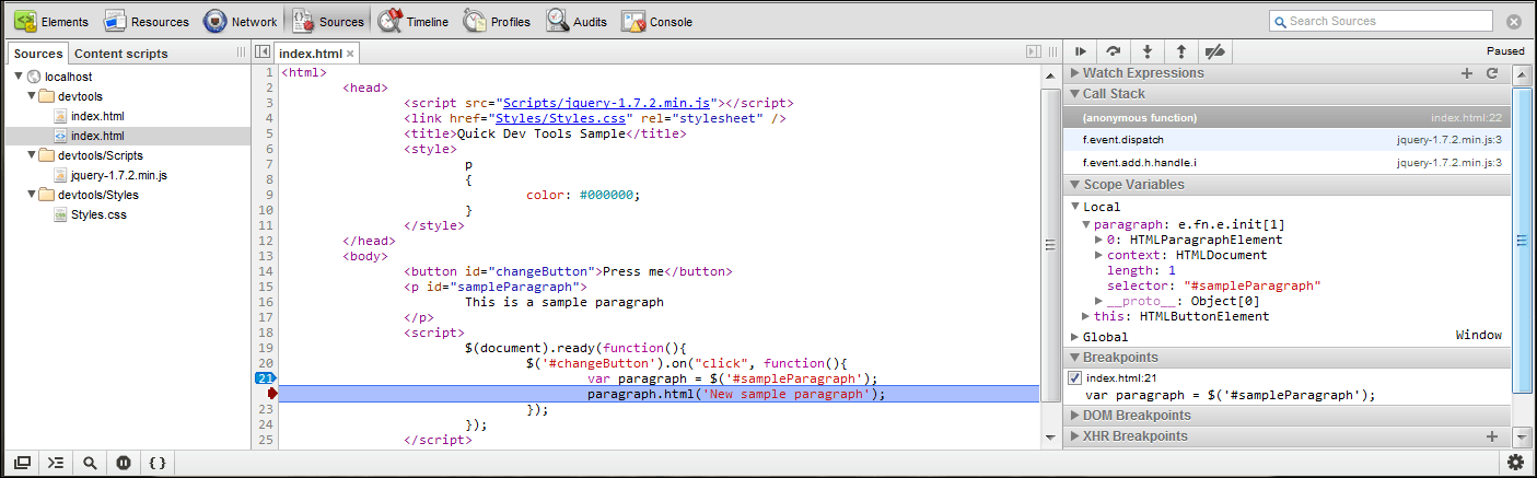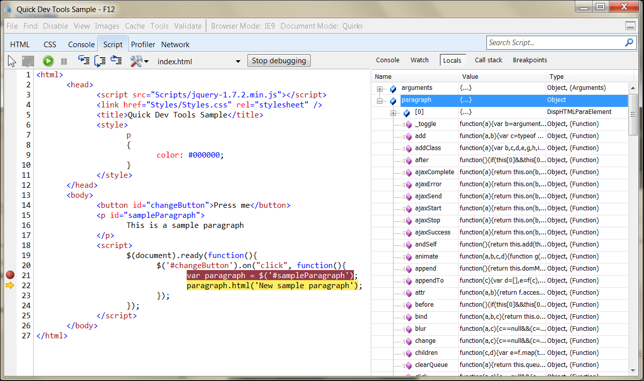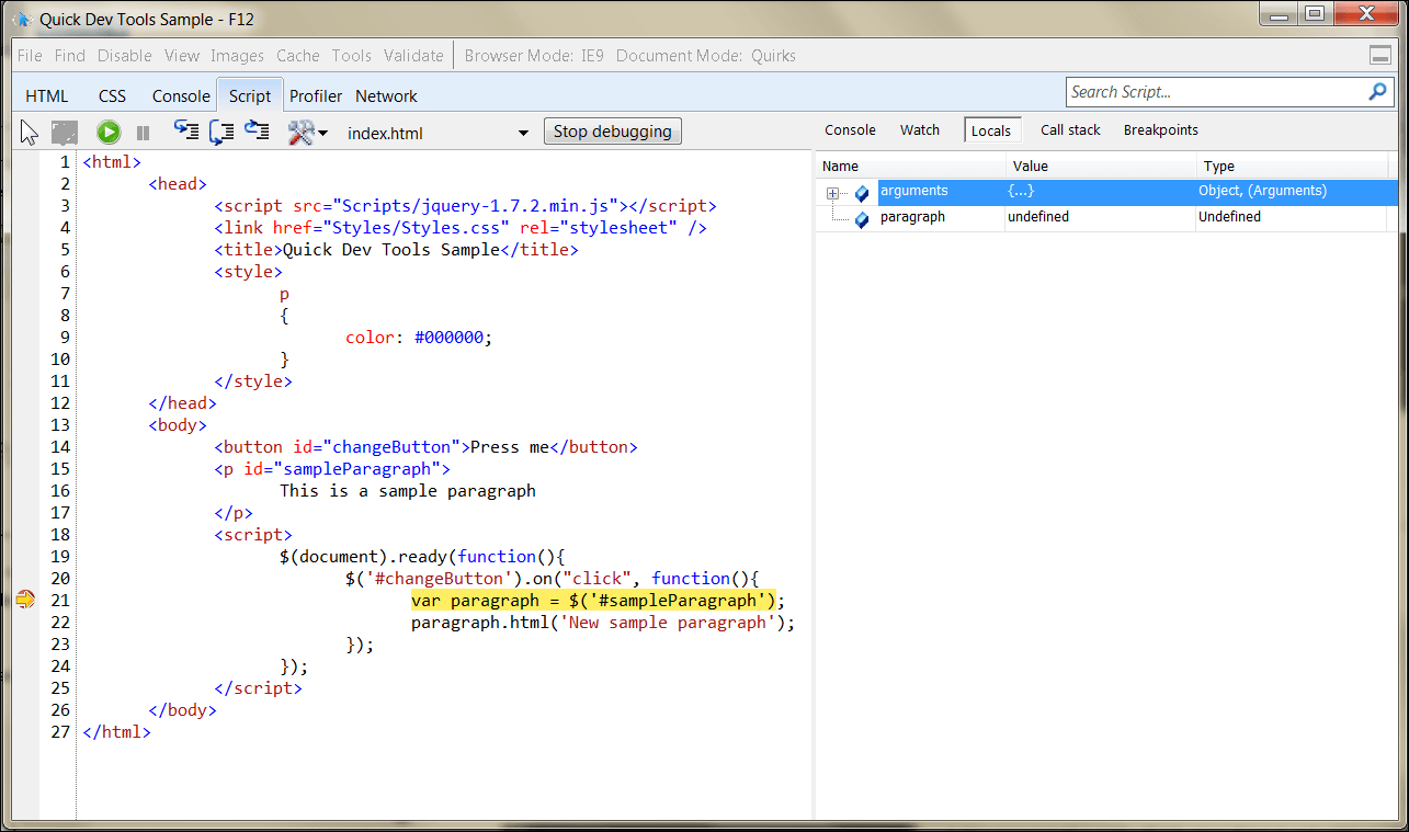 <html> <head> <script src="Scripts/jquery-1.7.2.min.js"></script> <link href="Styles/Styles.css" rel="stylesheet" /> <title>Quick Dev Tools Sample</title> <style> p { color: #000000; } </style> </head> <body> <button id="changeButton">Press me</button> <p id="sampleParagraph"> This is a sample paragraph </p> <script> $(document).ready(function(){ $('#changeButton').on("click", function(){ var paragraph = $('#sampleParagraph'); paragraph.html('New sample paragraph'); }); }); </script> </body></html>The important part here is the JavaScript that I’ve thrown in there inside of the HTML document. All it does is grab my paragraph element and change the HTML so that the text is slightly altered. While it’s a simple script it will do a lot for us in demonstrating what the Scripts tab can do and who isn’t a fan of having simple things teaching us a lot?