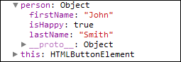 var person = new Object();person.firstName = "John";person.lastName = "Smith";person.isHappy = true;It would look like this: