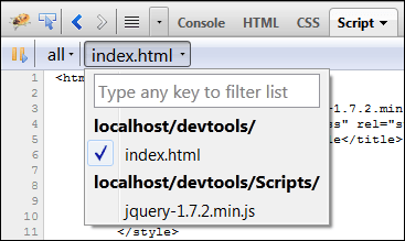 We don’t have the same three column structure as we do in the Chrome developer tools, but all of the same information is there. Instead of the file structure layout on the left hand side we have a dropdown containing all of the files we can debug. In the picture above it defaults to index.html, but we can click on it and see additional files, which right now is just jQuery (the only other JavaScript files).