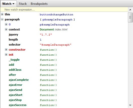 This is similar to what we saw in FireBug. However, everything is listed in alphabetical order (including jQuery methods) and it takes a while to find the properties that appeared at the top with Chrome or Firefox but everything is still there.
