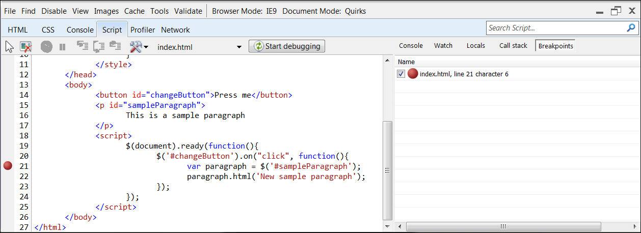 Why did we pick line number 21? It serves two purposes. First of all I want to make you aware of the fact that you can dynamically add or remove breakpoints as you want after the page has been loaded, there is no need to refresh the page or anything like that. Secondly, the piece of code we’re targeting here gets executed after the button on our page has been clicked, which hasn’t happened yet, and contains a variable: paragraph.