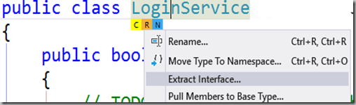 The caret will end up on the field name “_service”. From here, Create Constructor (Ctr-R, Ctr-C) and a constructor will be created with the ILoginService as a parameter. This is a convenient way to create injected constructors with JustCode. All of the fields that are selected will be added as parameters. You will need to update any code that instantiates this class to pass in an instance of the ILoginService. For now, you can use the factory that we utilized in Listing 4 in the constructor call.