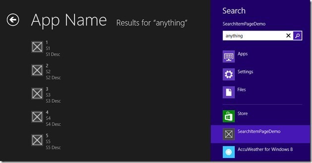 The rest of the work is taken care of for you. If you run the program and open the search charm and execute a search (it doesn’t matter what you search for, the results are hard coded) you get the results shown in the figure above.
