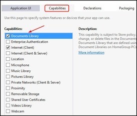 When you set this, however, you’ll discover that you need to provide additional file-association settings. Even applications that have access to the Documents Library must specify the supported extensions in advance. This is done through the Declarations tab.