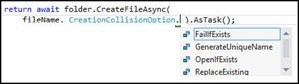 We are now ready to create the key method in our ViewModel: CreateFile. This method will take a sub-folder name and a file name and will create or open each in turn, returning a StorageFile. Because the method to create the folder is Asynchronous (as is the method to open a file) we’ll use the await keyword, and thus will mark this method with the async keyword and will return a Task<StorageFile>,