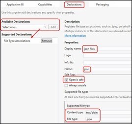 First, in the Available Declarations drop down, select File Type Associations and click Add. Under Properties select a Display name and a Name and check Open is Safe. In the Supported Files Type section add a content type (text/plain) and a File type (.json). Feel free to make up your own extension, as I have done here.