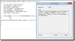 string JSON = JsonConvert.SerializeObject( cust ); That’s it! With that you’ve serialized the information from the user into a JSON string (as shown in the figure. Click on the figure to see full size).
