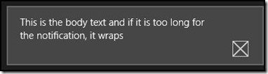 In its simplest form, that is all it takes to create a toast notification locally. We’ll take a look at using the Windows Notification Service to create toast notifications from the cloud in an upcoming blog post.