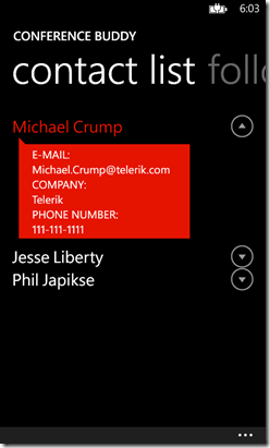 When we launch the application, and navigate to the “Contact List” screen then we will see our three contacts, Michael Crump, Jesse Liberty and Phil Japikse as shown in Figure 1. If we click on the arrow to the right our RadExpander control will show additional information as shown in Figure 2.