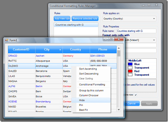 Another small improvement is the new consistent look of grid dialogs and context menus, which are now synchronized with the theme used by RadGridView. This is Q1’s new Breeze theme with a context menu and the Conditional Formatting dialog (which also has improved UI):