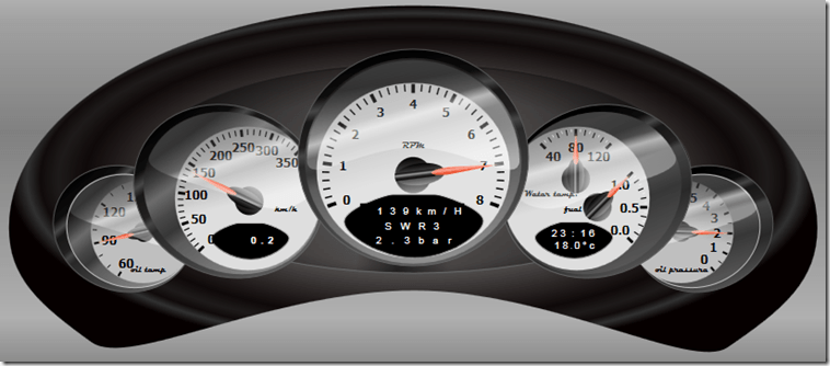 Presenting data to users can be done in a variety of ways, but gauges offer a unique way to present data with elegance.  Gauges are easily recognized by most users since they see them on a daily basis.  Think about when you drove to work this morning, you probably looked at your car dashboard which may have looked similar to the picture below.  You knew your speed, fuel status and a number of other important metrics at a glance.  Well, the RadGauge for WPF gives you the ability to implement this same powerful concept in your applications