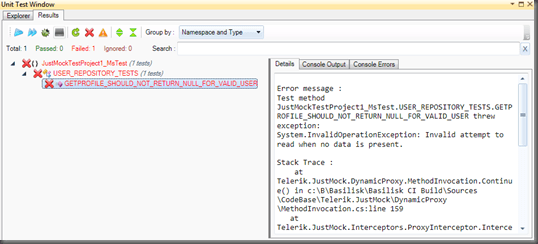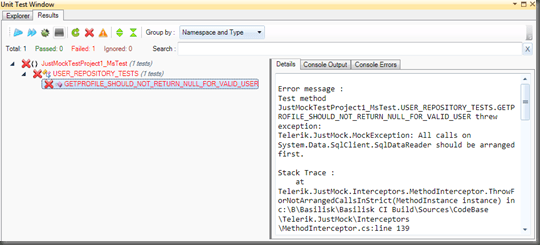As you can see, JustMock fails the test because there was a call to GetGuid(0), which was not arranged.