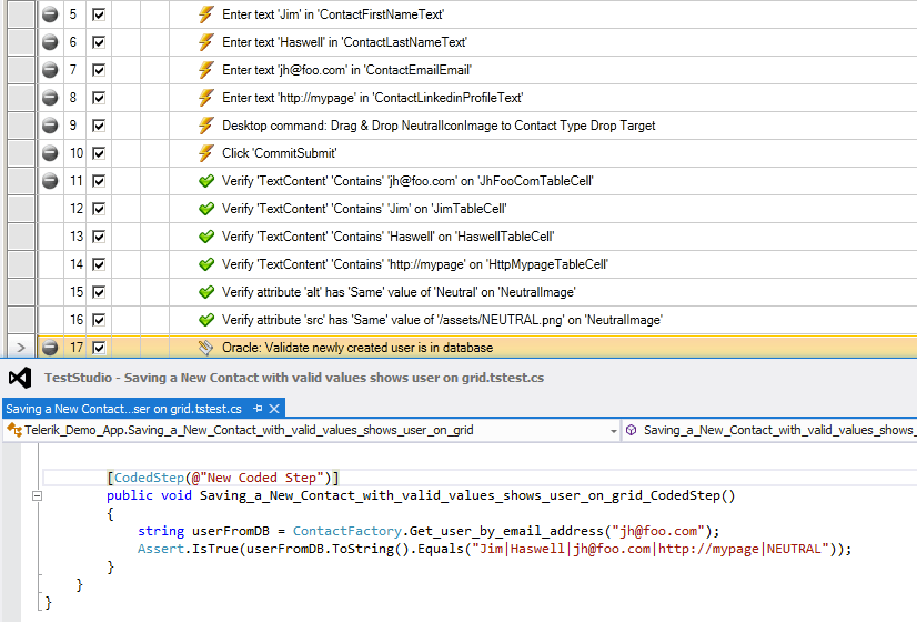Here we’re doing a two-step validation: first in steps 11-16 we’re confirming the UI accurately reflects the edits we’ve made. In step 17 we have a coded step which confirms the user was created in the database—the code for that is shown in the window below and also reflects our use of a backing API to handle easy communication to the database via the ContactFactory helper class.
