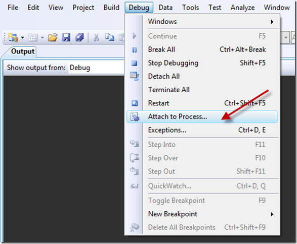 • In Visual Studio go to Debug menu –> Attach to Process…