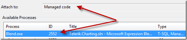 • Find the “Blend.exe” process in the list of available processes and make sure you will be debugging the “Managed Code” option before clicking the “Attach” button:
