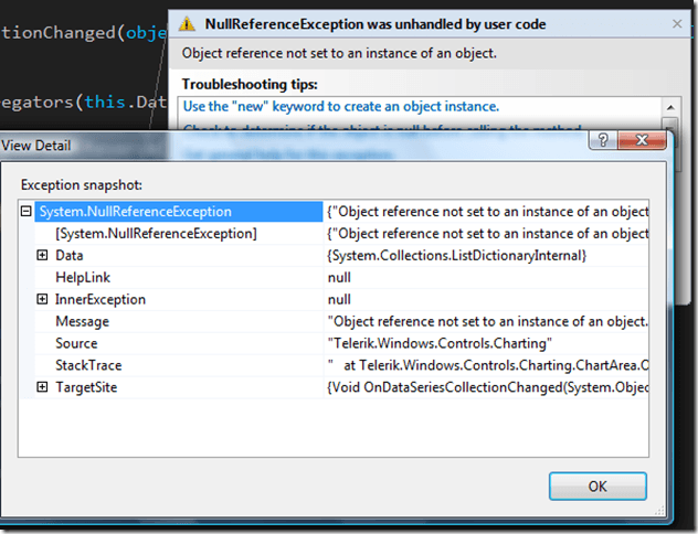 This clearly does not give us enough information to track the problem down. Fortunately there is an easier way to detect the problem instead of wandering around the code in a manual “debugging” session – the Visual Studio debugger.
