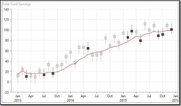 publicclassStockPriceService{publicstaticList<StockPrice> GetData(){var myStockPrices =newList<StockPrice>();Random r =newRandom();DateTime date =newDateTime( 2013, 1, 22 );for(inti = 0; i < 36; i++ ){Double low = r.Next( i - 5, i + 5 ) * 3;Double high = low + 20;Double open = low + 10;Double close = r.Next() % 2 == 0 ? high - 5 : open - 5;var stockPrice =newStockPrice(){Low = low,High = high,Open = open,Close = close,Date = date.AddMonths( i ),};myStockPrices.Add( stockPrice );}returnmyStockPrices;}}