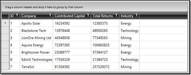 publicclassCompanyService{publicstaticObservableCollection<Company> GetCompanies(){var companies =newObservableCollection<Company>();companies.Add(newCompany() { ID = 1,Name ="Apollo Solar", ContributedCapital = 16234592,TotalReturns = 12385375, Industry ="Energy"} );companies.Add(newCompany() { ID = 2,Name ="Blackstone Tech", ContributedCapital = 13978448,TotalReturns = 48938263, Industry ="Technology"} );companies.Add(newCompany() { ID = 3,Name ="LionOre Mining Ltd", ContributedCapital = 44548938,TotalReturns = 77349263, Industry ="Mining"} );companies.Add(newCompany() { ID = 4,Name ="Aquios Energy", ContributedCapital = 72397385,TotalReturns = 100483823, Industry ="Energy"} );companies.Add(newCompany() { ID = 5,Name ="Brightcover Power", ContributedCapital = 23089777,TotalReturns = 57394127, Industry ="Energy"} );companies.Add(newCompany() { ID = 6,Name ="EdiniX Technologies", ContributedCapital = 17556329,TotalReturns = 21384723, Industry ="Technology"} );companies.Add(newCompany() { ID = 7,Name ="TerraSol", ContributedCapital = 81304392,TotalReturns = 257329372, Industry ="Mining"} );returncompanies;}