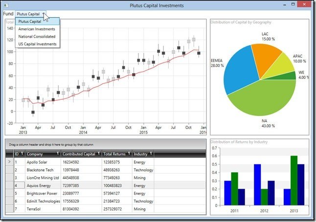 The scenario we will build is for a Fund Manager who monitors the performance of a private equity fund, Plutus Capital Investments, taking note of particular trends and the distribution of assets. Information is displayed on the dashboard using RadChartView (Pie) showing the distribution of capital by geography, RadChartView (Linear) to show total fund returns over time, and RadGridView showing company name, contributed capital, total returns, and industry. Lastly, ChartView (Bar) displays the distribution of returns by industry. The goal of the dashboard is to provide information on the status of the portfolio at a glance, and access, through a drop down, to information on other funds. The demo shows only the first page of the dashboard.