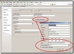 Open Property Settings window, select the Application tab (if not active). You should see an “Assembly Information…” button – click on it and it will open a dialog form with various assembly settings.