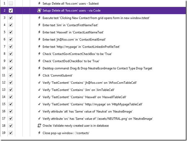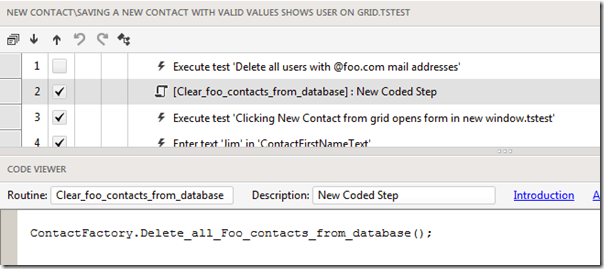 Here a developer has created a simple method (Delete_all_Foo_contacts_from_database) on a helper class (ContactFactory) in order to clear out test users. This makes it easy for less-technical testers to quickly and easily use just enough code to get the tester’s current job done without having to understand the deep internals of the system or the technical details of invoking a web service.
