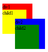 <!DOCTYPE html> <html> <head> <style type="text/css"> #div1, #div2{ position: absolute; } #child1{ position: absolute; width: 80px; height: 80px; background: yellow; z-index:100000; } #child2 { position:absolute; width: 80px; height: 80px; background: green; } #div1 { width: 100px; height: 100px; top: 100px; background: red; z-index:1; } #div2 { width: 100px; height: 100px; top: 150px; left: 50px; background: blue; z-index:2; } </style> </head> <body> <div id="div1">div1 <div id="child1"> child1 </div> </div> <div id="div2">div2 <div id="child2"> child1 </div> </div> </body> </html>