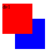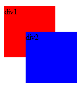 <html> <head> <style type="text/css"> #div1, #div2{ position: absolute; } #div1 { width: 100px; height: 100px; top: 100px; background: red; } #div2 { width: 100px; height: 100px; top: 150px; left: 50px; background: blue; } </style> </head> <body> <div id="div1">div1</div> <div id="div2">div2</div> </body> </html>