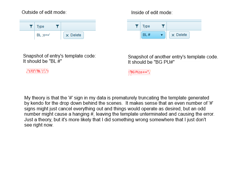 Also, along with this issue, even if I avoid the meltdown of the template, I do get a a weird rendering of drop down values that have a '#' character when I exit that cell's edit mode. I believe the garbled replacement for the pound sign is part of the generated template code (See attached image for this).