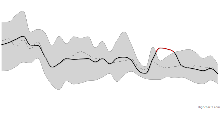 I’d like to draw an arearange chart and a line on one graph and I want the line to have a black color when inside the arearange but red color when outside the arearange.