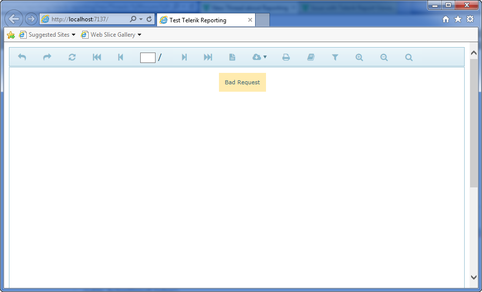 When loading a basic report into the report viewer, it shows 'Bad Request' (see attached screenshot). I have profiled this using Fiddler and traced this down to a problem in the REST service. On the request '/api/Reports/clients/113112-3522/parameters' it returns the response '{"message":"Missing report name"}'. I have tried setting various name parameters in the InstanceReportSource and on the report, but the problem still occurs.
