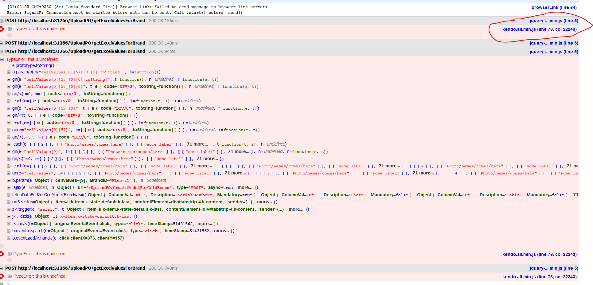 function fetchDataForKidsGridModel(ExcelVals) { debugger; var cellValues, range, ArrOfCellValue = [], CellValueArr, startPoint = 17, mandotoryColumn = "E"; var outletArr = []; var spreadsheet = $("#spreadsheet").data("kendoSpreadsheet"); var sheet = spreadsheet.activeSheet(); var endPoint = getSheetLength(sheet, startPoint, mandotoryColumn for (var l = 0; l < endPoint ; l++) { var StartColumn_CI = 85; CellValueArr = []; var arrOfOutlets = []; for (var i = 0; i < ExcelVals.length ; i++) { var rowCellNo = ExcelVals[i].ColumnVal.replace("#", startPoint).trim(); range = sheet.range(rowCellNo) cellValues = range.values(); if (cellValues[0][0] == null) { cellValues[0][0] = ""; } CellValueArr[i] = cellValues; } ArrOfCellValue[l] = CellValueArr; startPoint++; } //ERROR is thrown at this point while debugging $.ajax({ url: '/UploadPO/CreateModelForGridEcomm', type: 'POST', async: true, dataType: 'json', data: { cellValues: ArrOfCellValue, BrandID: brandName }, // success: function (result) { console.log(result); // you code comes here GetGrid(result) }, error: function (result) { //Error Handling if (result.success = true) { alert(result.responseText); } if (result.success = false) { alert(result.responseText); } } });}Any help would be much appreciated.