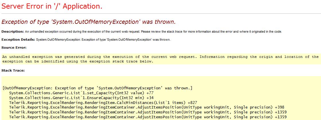 I would like to add that I to am running into some difficulties with Telerik Reporting on some rather large reports. I have attached along a screenshot of the error I typically get when trying to export to excel or to pdf and it is not browser specific. My row count is currently around 2000 rows. I am able to view the report in the report view just fine (through our website application), however I cannot export at all. Also, a lot of what others have reported here is concurrent with what I am experiencing as well.