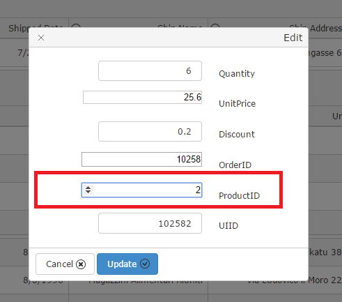 public ActionResult Read_Product([DataSourceRequest] DataSourceRequest request, int id){ return Json(context.Products.Where(i => i.CategoryID == id).ToDataSourceResult(request, e => new ProductViewModel { ProductID = e.ProductID, ProductName = e.ProductName, QuantityPerUnit = e.QuantityPerUnit, UnitPrice = e.UnitPrice, ReorderLevel = e.ReorderLevel, SupplierID = e.SupplierID, }));}