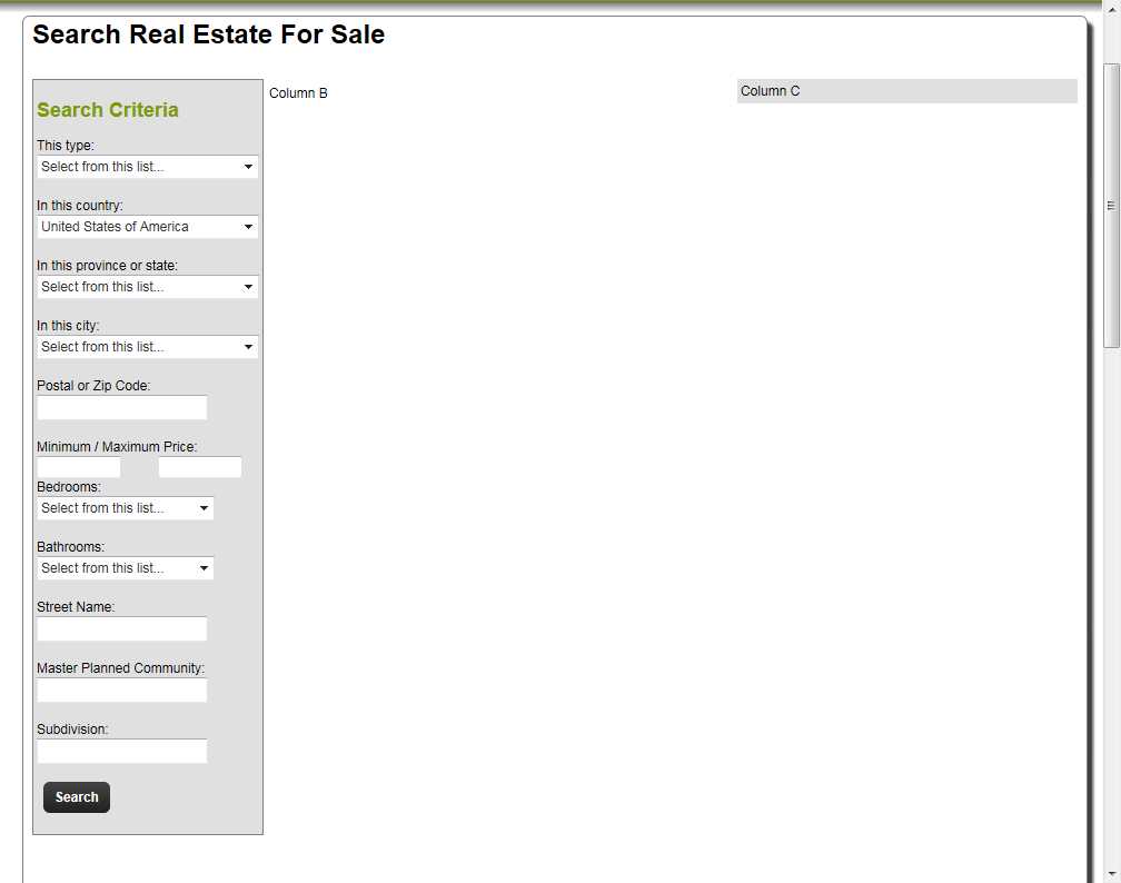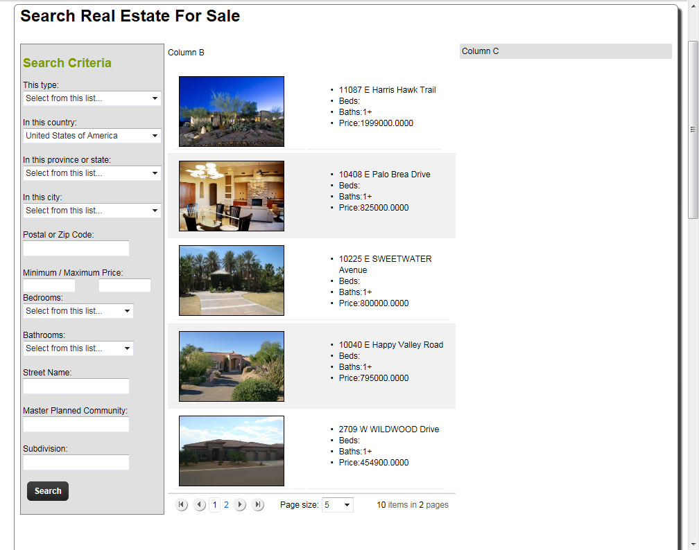 (2) A "how to" question: In the first attached graphic, you can see search criteria in the left-most column, the grid containing results in the middle column, and the right-most column is blank. I will be putting a small Google map in this space and want it to only contain "push pins" for the properties displayed in the current page of the grid. Is there a way I can do this? How and in what grid event would I be able to put the code to add the "push pins" each time a new grid page is displayed? In what event would I place the code to "clear the map" to ready it for the next n number pins? Feel free to ask questions if I did not explain myself adequately.