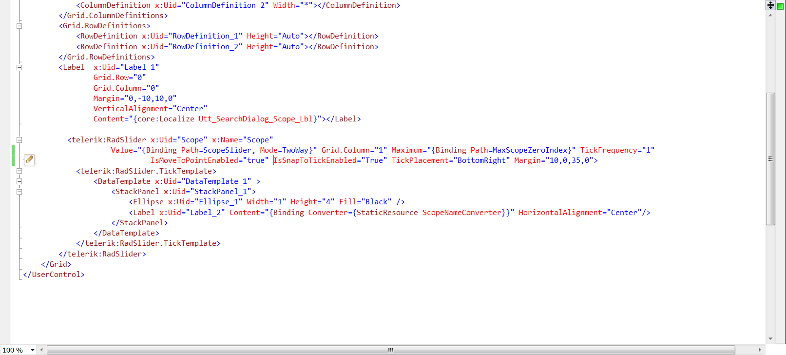 <telerik:RadSlider x:Uid="Scope" x:Name="Scope" <br> Value="{Binding Path=ScopeSlider, Mode=TwoWay}" Grid.Column="1" Maximum="{Binding Path=MaxScopeZeroIndex}" TickFrequency="1" IsMoveToPointEnabled="true" IsSnapToTickEnabled="True" TickPlacement="BottomRight" Margin="10,0,35,0"><br> <telerik:RadSlider.TickTemplate><br> <DataTemplate x:Uid="DataTemplate_1" ><br> <StackPanel x:Uid="StackPanel_1"><br> <Ellipse x:Uid="Ellipse_1" Width="1" Height="4" Fill="Black" /><br> <Label x:Uid="Label_2" Content="{Binding Converter={StaticResource ScopeNameConverter}}" HorizontalAlignment="Center"/><br> </StackPanel><br> </DataTemplate><br> </telerik:RadSlider.TickTemplate><br> </telerik:RadSlider>