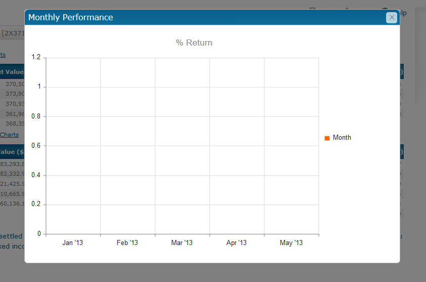 <div class="k-chart" id="chartPCT"></div><script> jQuery(function(){jQuery("#chartPCT").kendoChart({"title":{"text":"% Return"},"series":[{"name":"Month","type":"column","field":"Metrics.Return"}],"categoryAxis":[{"type":"Date","categories":["2013/01/31 00:00:00","2013/02/28 00:00:00","2013/03/31 00:00:00","2013/04/30 00:00:00","2013/05/31 00:00:00"]}],"dataSource":{"schema":{"model":{"fields":{"Granularity":{"type":"number"},"GranularityName":{"editable":false,"type":"string"},"Observation":{"type":"date"},"ObservationDescription":{"type":"string"},"IsTimeSeries":{"type":"boolean"},"Metrics":{"type":"object"},"ObservationDisplay":{"editable":false,"type":"string"}}}},"data":[{"Granularity":0,"GranularityName":"Monthly","Observation":"\/Date(1359619200000)\/","ObservationDescription":null,"IsTimeSeries":true,"Metrics":{"MarketValue":370505.870000,"NetInvested":494.280000,"Return":2.740981,"HasMarketValue":true,"HasNetInvested":true},"ObservationDisplay":"January"},{"Granularity":0,"GranularityName":"Monthly","Observation":"\/Date(1362038400000)\/","ObservationDescription":null,"IsTimeSeries":true,"Metrics":{"MarketValue":373901.670000,"NetInvested":284.740000,"Return":0.839149,"HasMarketValue":true,"HasNetInvested":true},"ObservationDisplay":"February"},{"Granularity":0,"GranularityName":"Monthly","Observation":"\/Date(1364713200000)\/","ObservationDescription":null,"IsTimeSeries":true,"Metrics":{"MarketValue":370930.070000,"NetInvested":0.000000,"Return":-0.794754,"HasMarketValue":true,"HasNetInvested":true},"ObservationDisplay":"March"},{"Granularity":0,"GranularityName":"Monthly","Observation":"\/Date(1367305200000)\/","ObservationDescription":null,"IsTimeSeries":true,"Metrics":{"MarketValue":361961.050000,"NetInvested":0.000000,"Return":-2.417981,"HasMarketValue":true,"HasNetInvested":true},"ObservationDisplay":"April"},{"Granularity":0,"GranularityName":"Monthly","Observation":"\/Date(1369983600000)\/","ObservationDescription":null,"IsTimeSeries":true,"Metrics":{"MarketValue":368352.560000,"NetInvested":0.000000,"Return":1.765800,"HasMarketValue":true,"HasNetInvested":true},"ObservationDisplay":"May"}]}});});</script> </div><script> jQuery(function(){jQuery("#window_Monthly").kendoWindow({"modal":true,"iframe":false,"draggable":true,"pinned":false,"title":"Monthly Performance - Account ","resizable":false,"content":null,"width":680,"height":430,"actions":["Close"]});});</script>