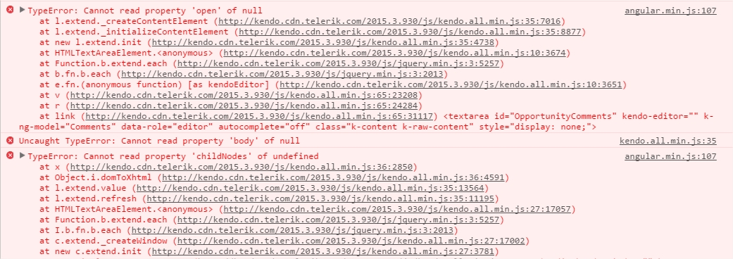 When a window contains a kendo editor angular throws an exception.