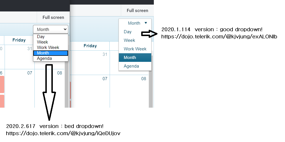 The change to the dropdown was part of a larger set of modifications of the Scheduler's toolbar. The idea was to create a consistent behavior in all the supported browsers. We faced issues achieving this with the previous dropdown rendered as ul and li element and styled to look as a DropDownList, and because of that it was replaced by a select element.