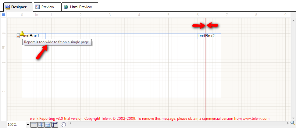 Generally when the report is too wide to fit on a single page, it is natural that the content that does not fit, would be moved on the second page (see screenshot). If you do not want that to happen, make sure that the report width is enough to fit everything and if it is not, you can increase the page size through the PageSettings -> Width.