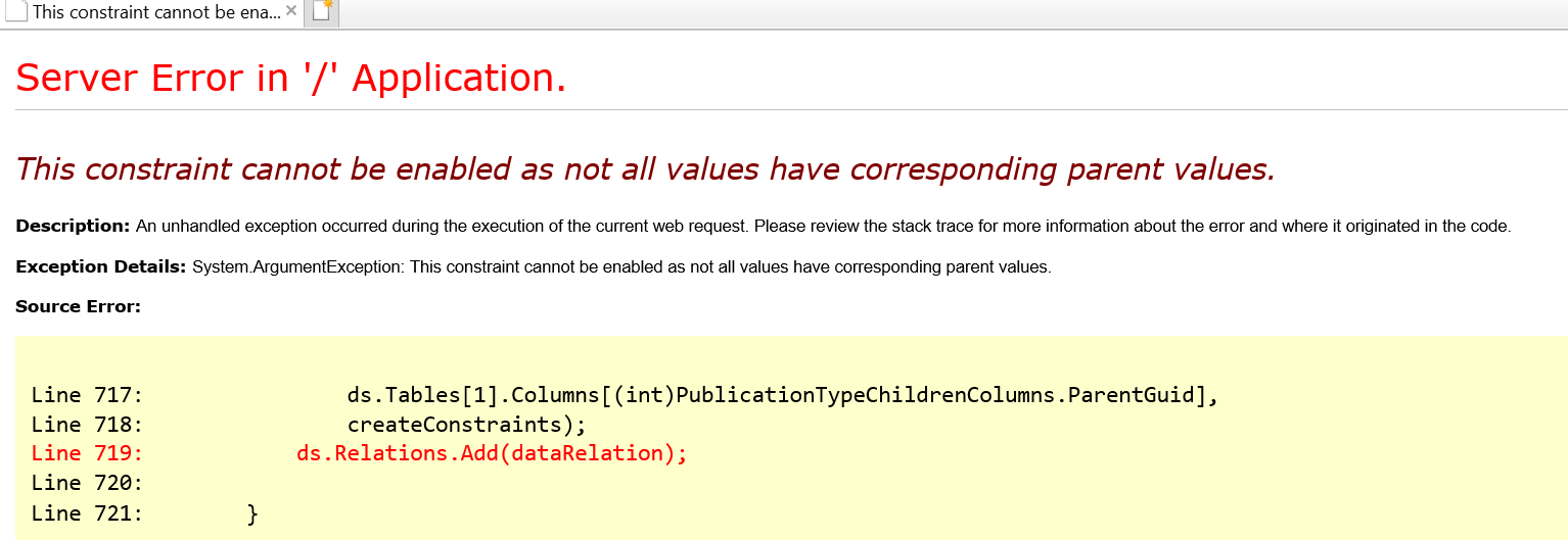 Exception Details: System.ArgumentException: This constraint cannot be enabled as not all values have corresponding parent values.