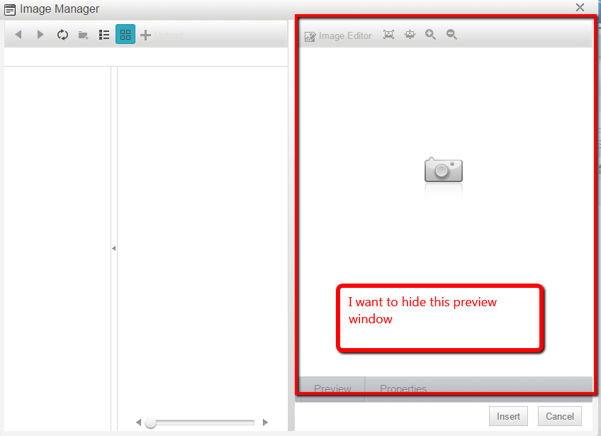 We tried with the CSS but it does not work. So, can you please suggest the proper way to hide only the preview and properties in the image manager window of RadEditor.