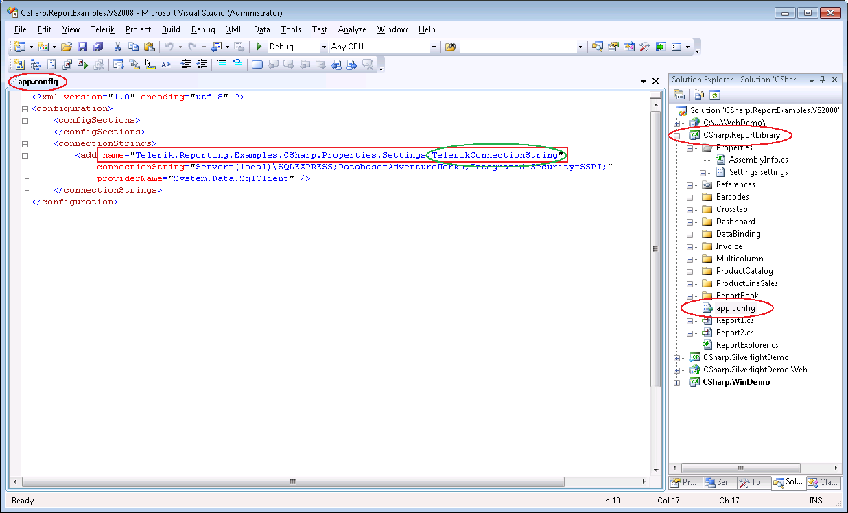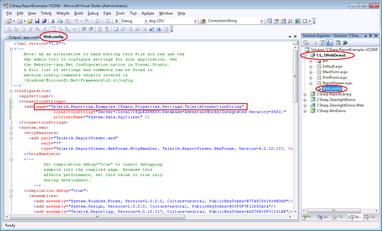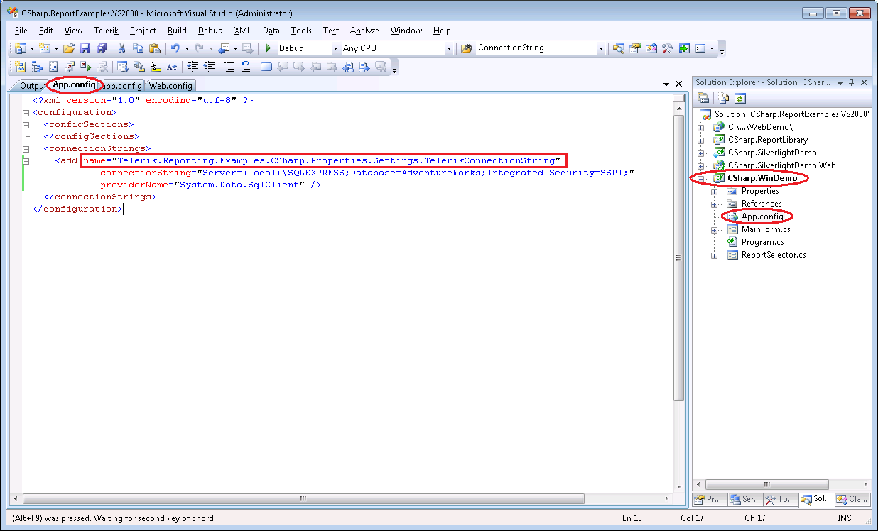 Note that you should use the full name of the connection string. You can find it in the app.config file of the class library. After locating it, just copy and paste it in the respective section of the web.config file of the Web Site/Application and the App.config file of the WinForms application. See the attached screenshots for reference.