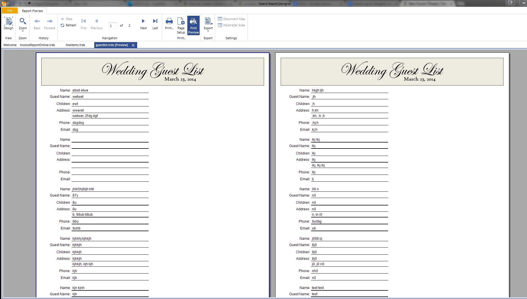 <?xml version="1.0" encoding="utf-8"?><Report DataSourceName="sqlDataSource1" Width="8.1in" Name="guestlist" SnapGridSize="0.1in" xmlns="http://schemas.telerik.com/reporting/2012/3.3"> <Style> <BorderWidth Default="0in" /> </Style> <DataSources> <SqlDataSource ConnectionString="STRINGNAME" SelectCommand="select * from guestlist order by lastname" Name="sqlDataSource1" /> </DataSources> <Items> <DetailSection Height="1.8in" Name="detail"> <Style> <BorderStyle Top="None" Bottom="None" Left="None" Right="None" /> <BorderColor Top="Black" Bottom="Black" Left="Black" Right="Black" /> <BorderWidth Top="1pt" Bottom="1pt" Left="1pt" Right="1pt" /> </Style> <Items> <TextBox Width="0.9in" Height="0.2in" Left="0.15in" Top="0.07in" Value="Name:" Name="textBox1"> <Style TextAlign="Right" VerticalAlign="Middle"> <BorderStyle Top="None" Bottom="None" Left="None" Right="None" /> <BorderColor Top="Black" Bottom="Black" Left="Black" Right="Black" /> <BorderWidth Top="1pt" Bottom="1pt" Left="1pt" Right="1pt" /> <Font Size="9pt" /> </Style> </TextBox> <TextBox Width="0.9in" Height="0.2in" Left="0.15in" Top="0.3in" Value="Guest Name:" Name="textBox4"> <Style TextAlign="Right" VerticalAlign="Middle"> <BorderStyle Top="None" Bottom="None" Left="None" Right="None" /> <BorderColor Top="Black" Bottom="Black" Left="Black" Right="Black" /> <BorderWidth Top="1pt" Bottom="1pt" Left="1pt" Right="1pt" /> <Font Size="9pt" /> </Style> </TextBox> <TextBox Width="0.9in" Height="0.2in" Left="0.15in" Top="0.5625in" Value="Children:" Name="textBox5"> <Style TextAlign="Right" VerticalAlign="Middle"> <BorderStyle Top="None" Bottom="None" Left="None" Right="None" /> <BorderColor Top="Black" Bottom="Black" Left="Black" Right="Black" /> <BorderWidth Top="1pt" Bottom="1pt" Left="1pt" Right="1pt" /> <Font Size="9pt" /> </Style> </TextBox> <TextBox Width="0.9in" Height="0.2in" Left="0.15in" Top="0.8in" Value="Address:" Name="textBox6"> <Style TextAlign="Right" VerticalAlign="Middle"> <BorderStyle Top="None" Bottom="None" Left="None" Right="None" /> <BorderColor Top="Black" Bottom="Black" Left="Black" Right="Black" /> <BorderWidth Top="1pt" Bottom="1pt" Left="1pt" Right="1pt" /> <Font Size="9pt" /> </Style> </TextBox> <TextBox Width="0.9in" Height="0.2in" Left="0.15in" Top="1.25in" Value="Phone:" Name="textBox8"> <Style TextAlign="Right" VerticalAlign="Middle"> <BorderStyle Top="None" Bottom="None" Left="None" Right="None" /> <BorderColor Top="Black" Bottom="Black" Left="Black" Right="Black" /> <BorderWidth Top="1pt" Bottom="1pt" Left="1pt" Right="1pt" /> <Font Size="9pt" /> </Style> </TextBox> <TextBox Width="0.9in" Height="0.2in" Left="0.15in" Top="1.5in" Value="Email:" Name="textBox9"> <Style TextAlign="Right" VerticalAlign="Middle"> <BorderStyle Top="None" Bottom="None" Left="None" Right="None" /> <BorderColor Top="Black" Bottom="Black" Left="Black" Right="Black" /> <BorderWidth Top="1pt" Bottom="1pt" Left="1pt" Right="1pt" /> <Font Size="9pt" /> </Style> </TextBox> <TextBox Width="2.80000025431315in" Height="0.2in" Left="1.10000014305115in" Top="0.0700000151991844in" Value="=Fields.FirstName + " " + Fields.LastName" Name="textBox10"> <Style VerticalAlign="Middle"> <BorderStyle Top="None" Bottom="Solid" Left="None" Right="None" /> <BorderColor Top="Black" Bottom="Black" Left="Black" Right="Black" /> <BorderWidth Top="1pt" Bottom="1pt" Left="1pt" Right="1pt" /> <Font Size="9pt" /> <Padding Left="0.0299999993294477in" /> </Style> </TextBox> <TextBox Width="2.80000025431315in" Height="0.2in" Left="1.10000014305115in" Top="0.3in" Value="=Fields.Guests" Name="textBox11"> <Style VerticalAlign="Middle"> <BorderStyle Top="None" Bottom="Solid" Left="None" Right="None" /> <BorderColor Top="Black" Bottom="Black" Left="Black" Right="Black" /> <BorderWidth Top="1pt" Bottom="1pt" Left="1pt" Right="1pt" /> <Font Size="9pt" /> <Padding Left="0.03in" /> </Style> </TextBox> <TextBox Width="2.80000025431315in" Height="0.2in" Left="1.10000014305115in" Top="0.5625in" Value="=Fields.Children" Name="textBox12"> <Style VerticalAlign="Middle"> <BorderStyle Top="None" Bottom="Solid" Left="None" Right="None" /> <BorderColor Top="Black" Bottom="Black" Left="Black" Right="Black" /> <BorderWidth Top="1pt" Bottom="1pt" Left="1pt" Right="1pt" /> <Font Size="9pt" /> <Padding Left="0.03in" /> </Style> </TextBox> <TextBox Width="2.80000025431315in" Height="0.2in" Left="1.10000014305115in" Top="0.8in" Value="=Fields.Street" Name="textBox13"> <Style VerticalAlign="Middle"> <BorderStyle Top="None" Bottom="Solid" Left="None" Right="None" /> <BorderColor Top="Black" Bottom="Black" Left="Black" Right="Black" /> <BorderWidth Top="1pt" Bottom="1pt" Left="1pt" Right="1pt" /> <Font Size="9pt" /> <Padding Left="0.03in" /> </Style> </TextBox> <TextBox Width="2.80000025431315in" Height="0.2in" Left="1.10000014305115in" Top="1in" Value="=Fields.City + ", " + Fields.State + " " + Fields.Zip