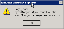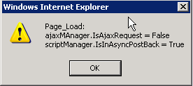 protected void Page_Load(object sender, EventArgs e){ RadAjaxManager ajaxManager = RadAjaxManager.GetCurrent(this); ScriptManager scriptManager = ScriptManager.GetCurrent(this); ajaxManager.AjaxSettings.AddAjaxSetting(BandQualificationsFormDetails, PanelCadetSelectionList); ajaxManager.Alert(string.Format("Page_Load: \najaxMAnager.IsAjaxRequest = {0} \nscriptManager.IsInAsyncPostBack = {1}", ajaxManager.IsAjaxRequest, scriptManager.IsInAsyncPostBack)); }When I select a value in a combobox in the web user control BandQualificationsFormDetails (errorajax1).