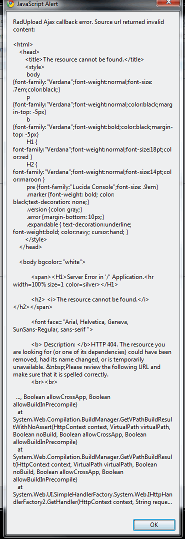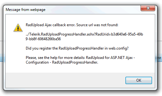 What version of RadUpload do you use? Please make sure that there are both RadProgressArea and RadProgressManager on your page. Also try to manually access the handler with the following syntax: