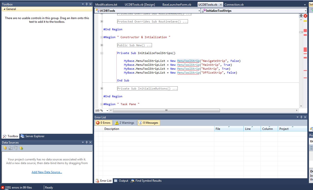 Probably the biggest annoance I have so far with JustCode is that I have a box in the status bar that says "2201 errors in 99 files". When in fact there are no errors. It seems be struggle with Structures. I don't use structures often, but the applicaiton that I started working on a few weeks ago, the previous developer used them all over the place.