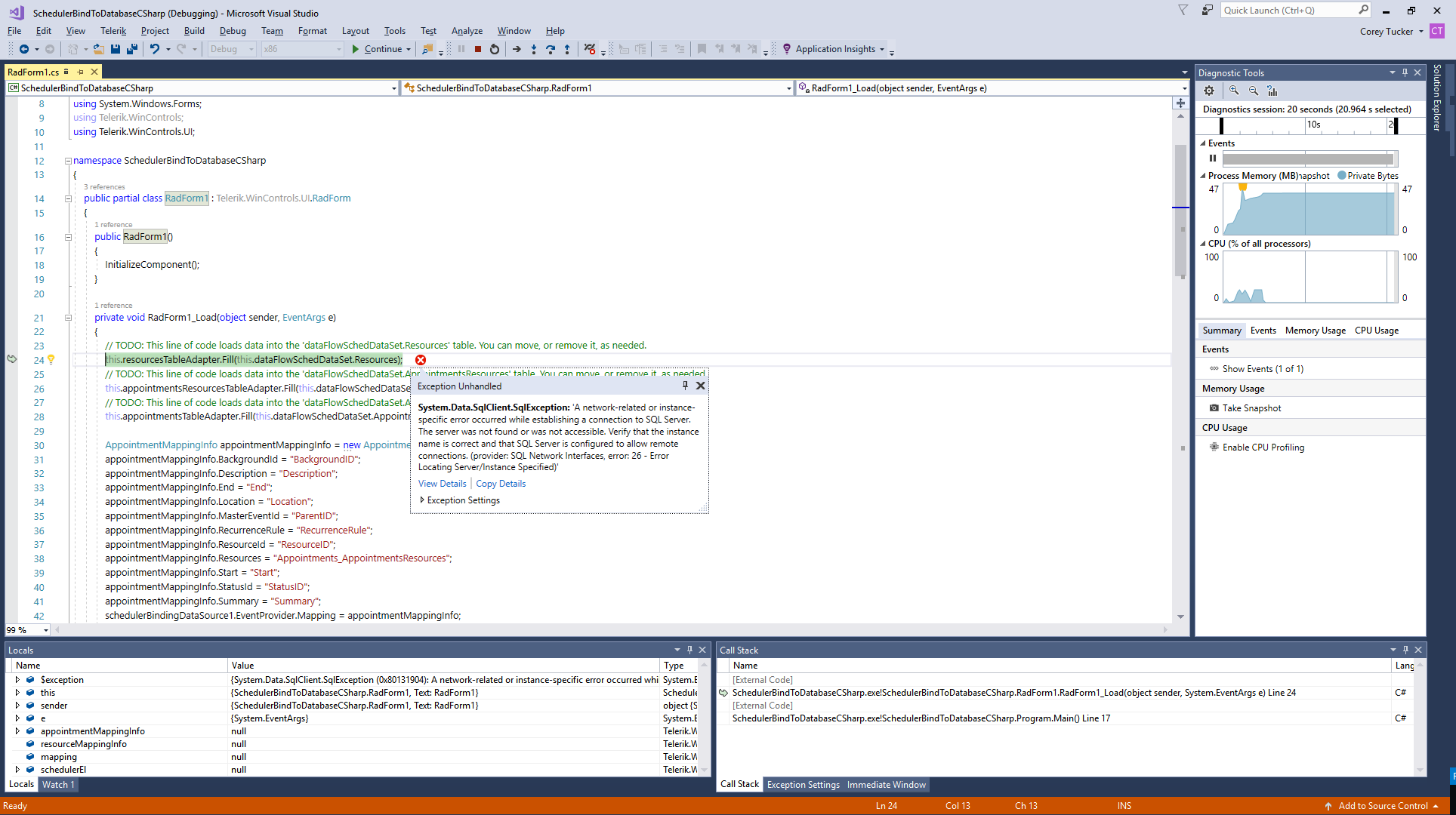 I have tested binding RadScheduler to my SQL server and it seems to work as expected with the latest version. I have attached a sample project for your reference. I have included a backup file of my database as well. Could you please specify the exact steps how to reproduce the problem with the project? Otherwise, feel free to submit a support ticket where you can provide a runnable sample project demonstrating the problem. Thus, we would be able to make an adequate analysis of the problem and assist you further. Thank you in advance.