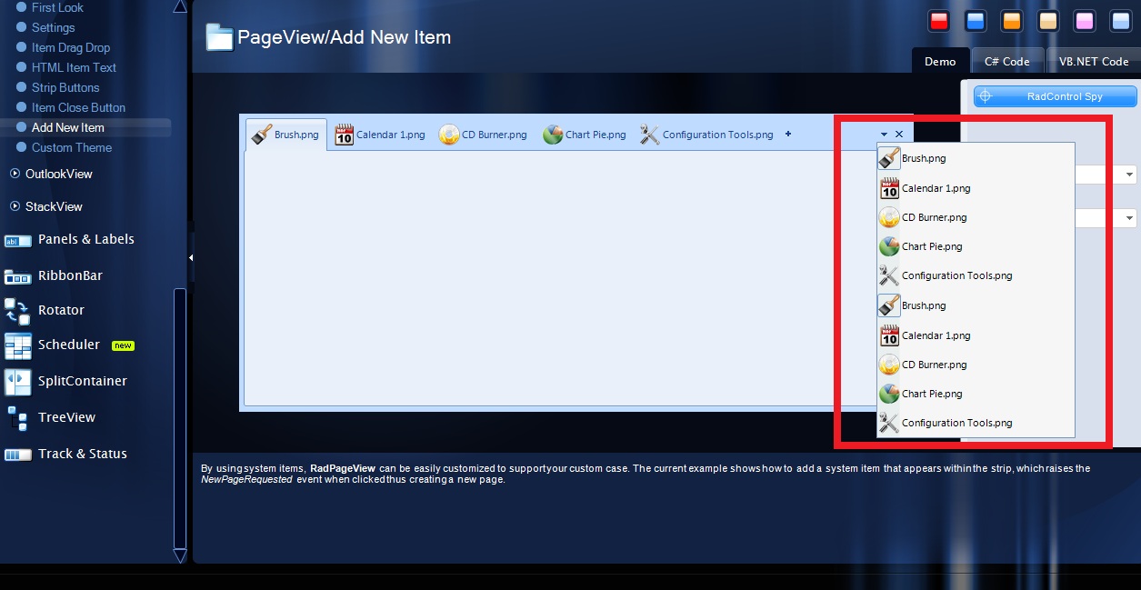 public Form1(){ InitializeComponent(); var strip = this.radPageView1.ViewElement as RadPageViewStripElement; strip.StripButtons = StripViewButtons.All; var stripViewItemsContainer = strip.Children[0] as StripViewItemContainer; var stripViewButtonsPanel = stripViewItemsContainer.Children[1] as StripViewButtonsPanel; stripViewButtonsPanel.ItemListButton.MouseDown += new MouseEventHandler(ItemListButton_MouseDown);}void ItemListButton_MouseDown(object sender, MouseEventArgs e){ var contextMenu = typeof(RadPageViewElement).GetFields(System.Reflection.BindingFlags.NonPublic | System.Reflection.BindingFlags.Instance). Where(f=>f.FieldType == typeof(RadContextMenu)).FirstOrDefault(); //either clear the exiting context menu var instanceContextMenu = contextMenu.GetValue(radPageView1.ViewElement) as RadContextMenu; if (instanceContextMenu != null) { instanceContextMenu.Items.Clear(); } // or create a new one //contextMenu.SetValue(radPageView1.ViewElement, new RadContextMenu());}Hope this helps, if you have any other questions or comments, please let me know,